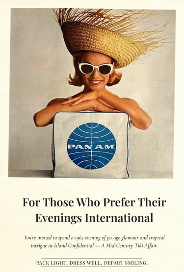 On this particular Saturday evening, Pan American Airways invites you to step aboard Flight 1962 — a first-class passage into the golden age of global travel, polished glamour, tropical possibility, and quiet intrigue.